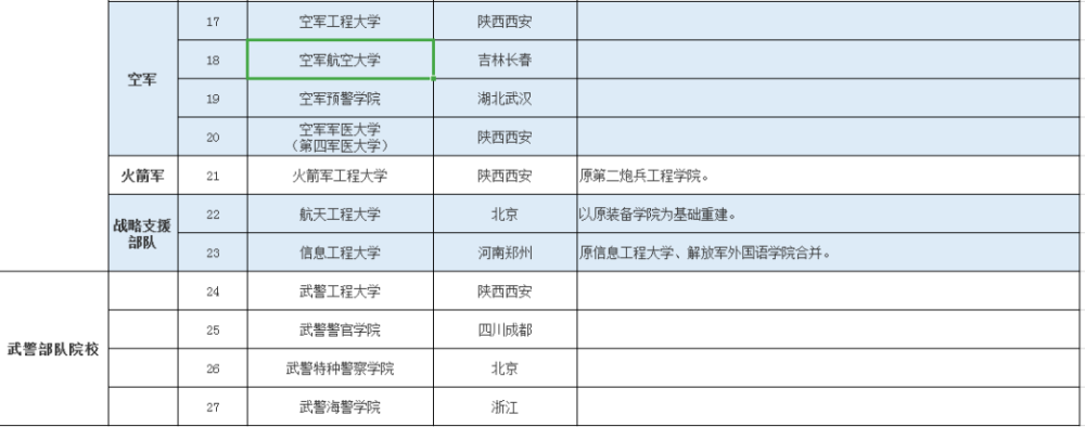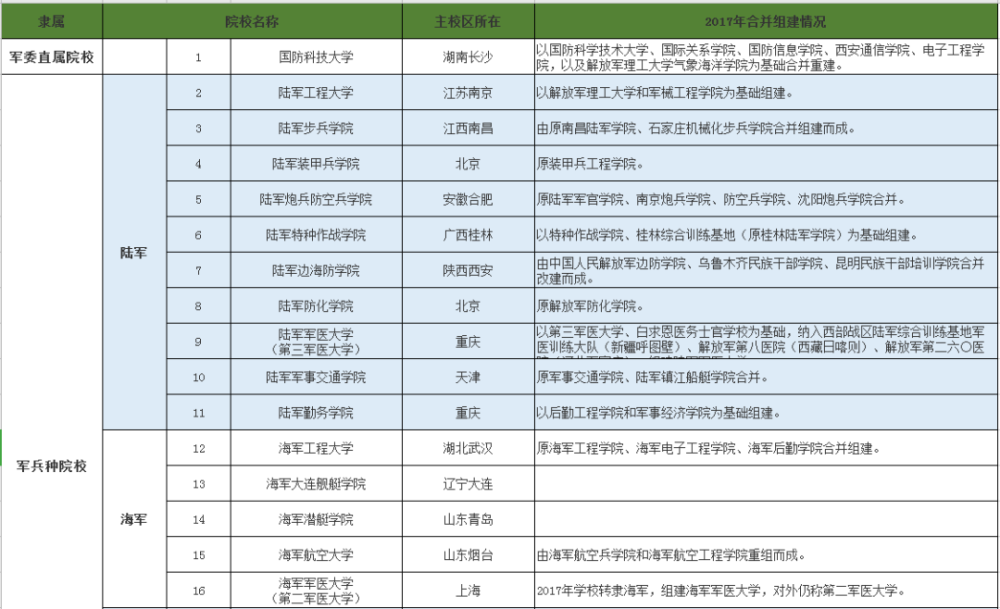 目前官网可以查:国防科大,三所军医大学,海军工程大学,空军工程大学,武警工程大学。