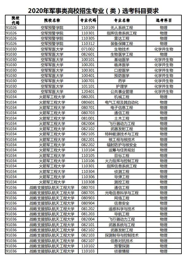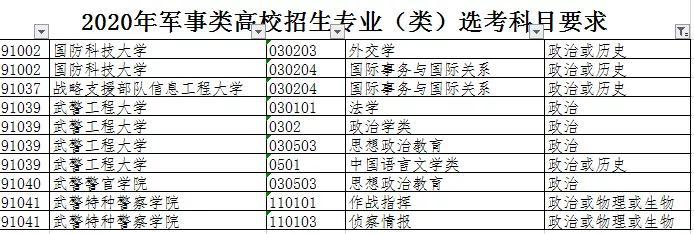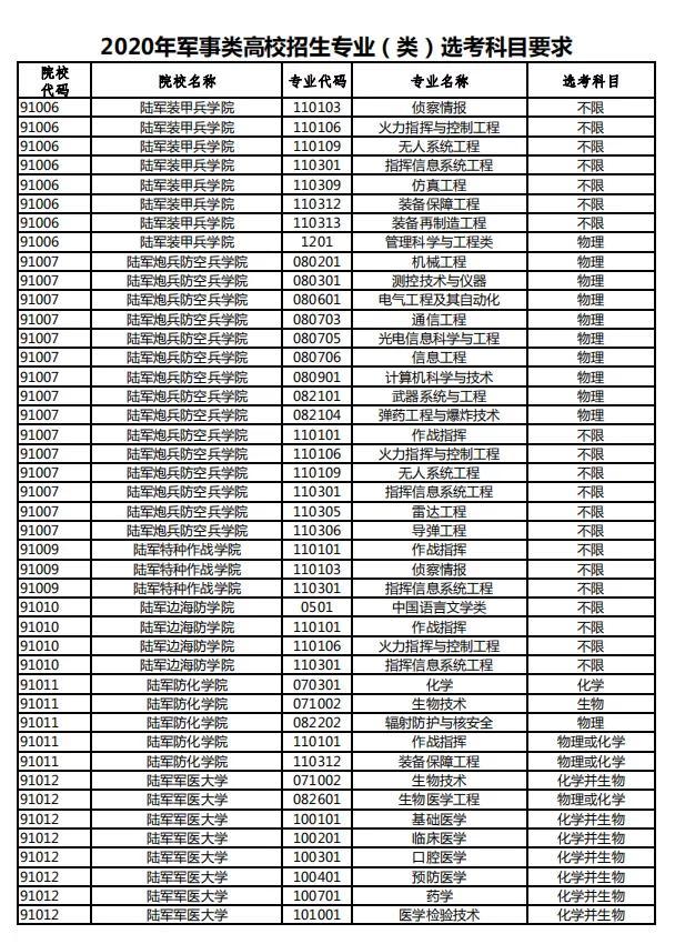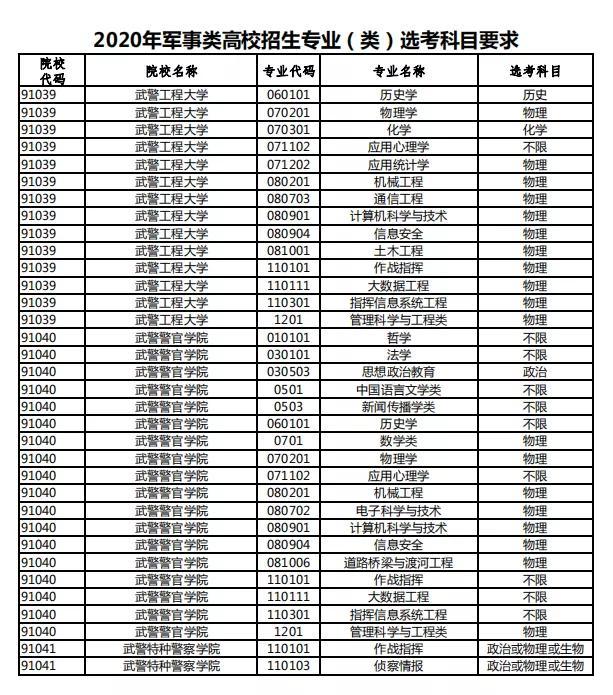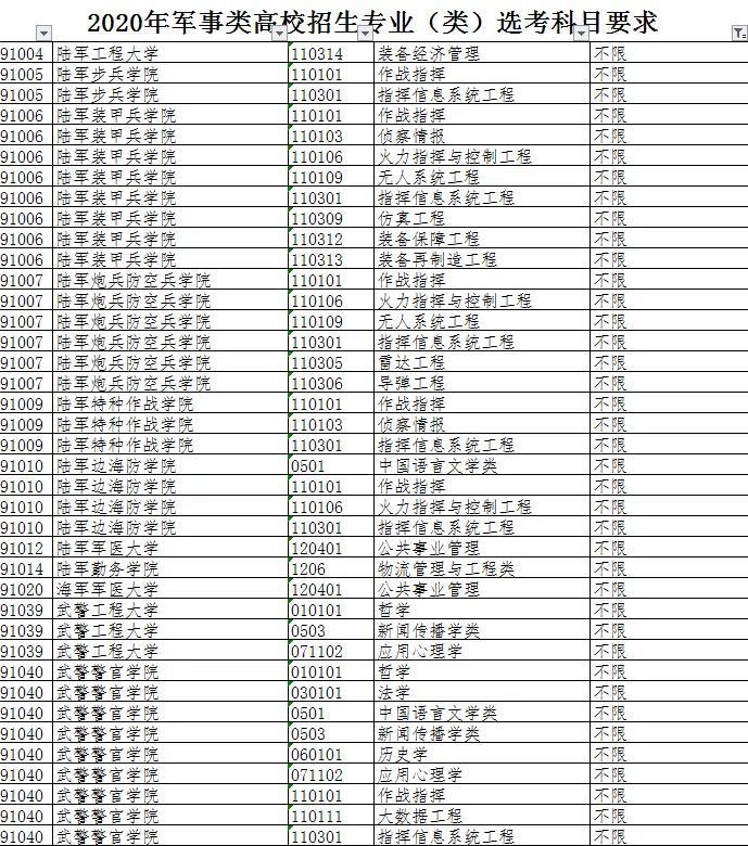 部分军校专业不限选考科目