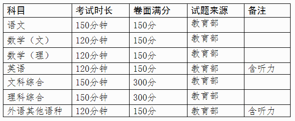 我区普通高考全国统考各科目均采用教育部命制的试题。全国统考各科考试时长及赋分如下:
