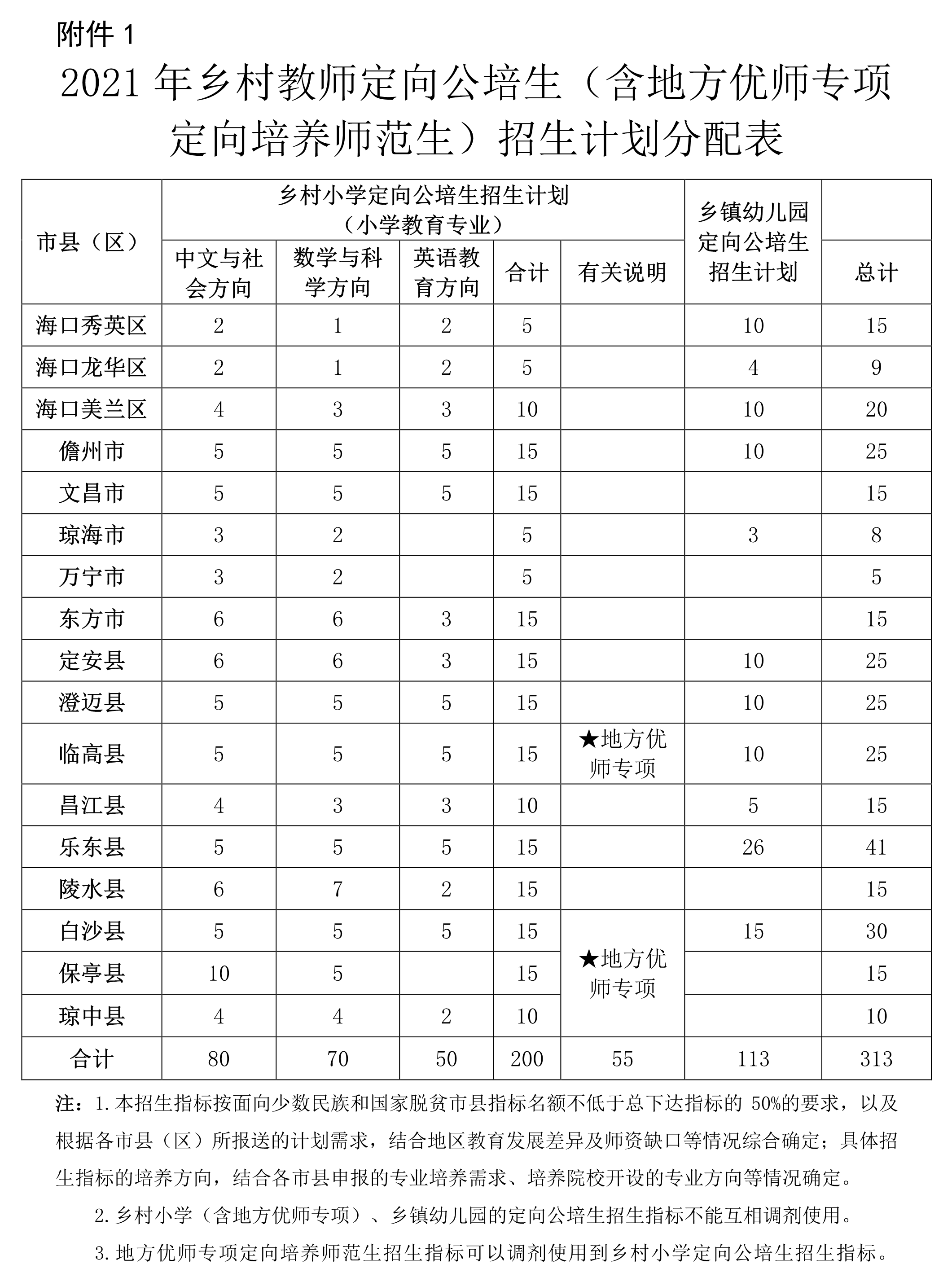 根据《教育部办公厅关于做好2024年中西部欠发达地区优秀教师定向培养工作的通知》(教师厅〔2024〕3号)要求和市县实际申报需求,2024年临高、白沙、保亭、琼中等国家脱贫县共招收地方优师专项定向培养师范生55名,名额分配详见《2024年乡村教师定向公培生(含地方优师专项定向培养师范生)招生计划分配表》(附件1)。