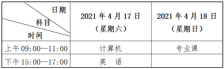 (四)考试时间。全省统一考试时间为2021年4月17日至18日。具体考试时间与考试科目安排如下(北京时间):