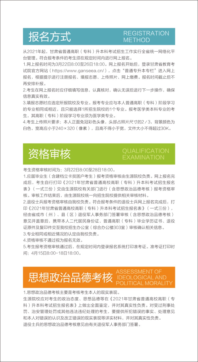 第一章 总则 第一条 根据新疆维吾尔自治区教育考试院《关于做好自治区2021年普通高职(专科)单独招生工作的通知》文件精神。我院2021年继续开展单独招生工作,积极进行改革探索,完善分类单招考试和录取机制,遵循公平、公正、公开的原则,选拔适合自身培养模式并热爱高职教育的优质生源,进....