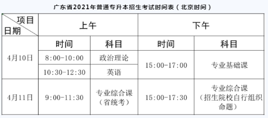 (五)普通专升本招生考试时间为2021年4月10日(星期六)至11日(星期日)两天,具体安排见下表: