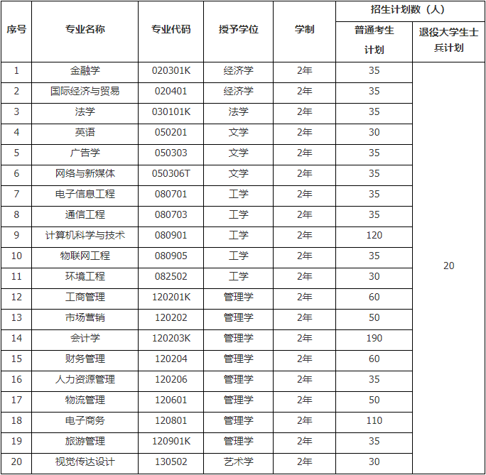 2.退役大学生士兵。应征入伍服义务兵役退役的2021年湖北高校普通全日制高职高专应届毕业生,报考时能如期毕业,服役期间未受过处分;或2020年退役的湖北高校普通全日制高职高专毕业生,已取得普通全日制专科毕业证,服役期间未受过处分。其中,在服役期间荣立三等功及以上奖励的,可申请免试就读我校某个专升本招生专业。
