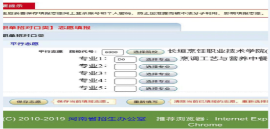 4、点击右侧相应类型填报志愿,进入相应的页面,输入长垣烹饪职业技术学院代号6300和要报考的专业代号,填报完成后点击“保存志愿”完成志愿填报。