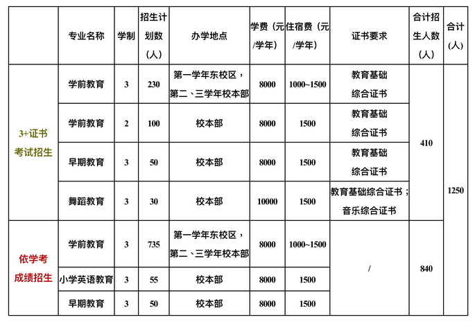 学校根据社会对教育人才的需要,2021年招收学前教育(含三年制、两年制)、早期教育、小学英语教育、音乐教育、美术教育、舞蹈教育、体育教育师范类专业共7个,计划招生共1680人。学校2021年春季分类考试招收学前教育,舞蹈教育,早期教育,小学英语教育专业学生,招生计划如下表: