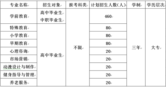 学校现有在编教职员工205人,专任教师188人,50%为研究生学历,教授、副教授职称102人,教育专家库成员、省市级骨干教师、专业带头人、科研型名教师55人,“双师型”教师113人,学校常年聘请省内知名幼教专家、知名园所园长、教师作为客座教授驻校讲学。目前开设学前教育、特殊教育、音乐教育、美术教育、早期教育、小学教育、美术7个专业,2021年新增设心理咨询、动漫设计与制作、市场营销、健身指导与管理、养老服务5个专业,共计12个专业,两个专业群,一个特色专业,现有全日制在校生5300余人。多年来,累计培养毕业生近四万人,就业率一直保持在95%以上,毕业生遍布全国19个省、自治区的51座城市。