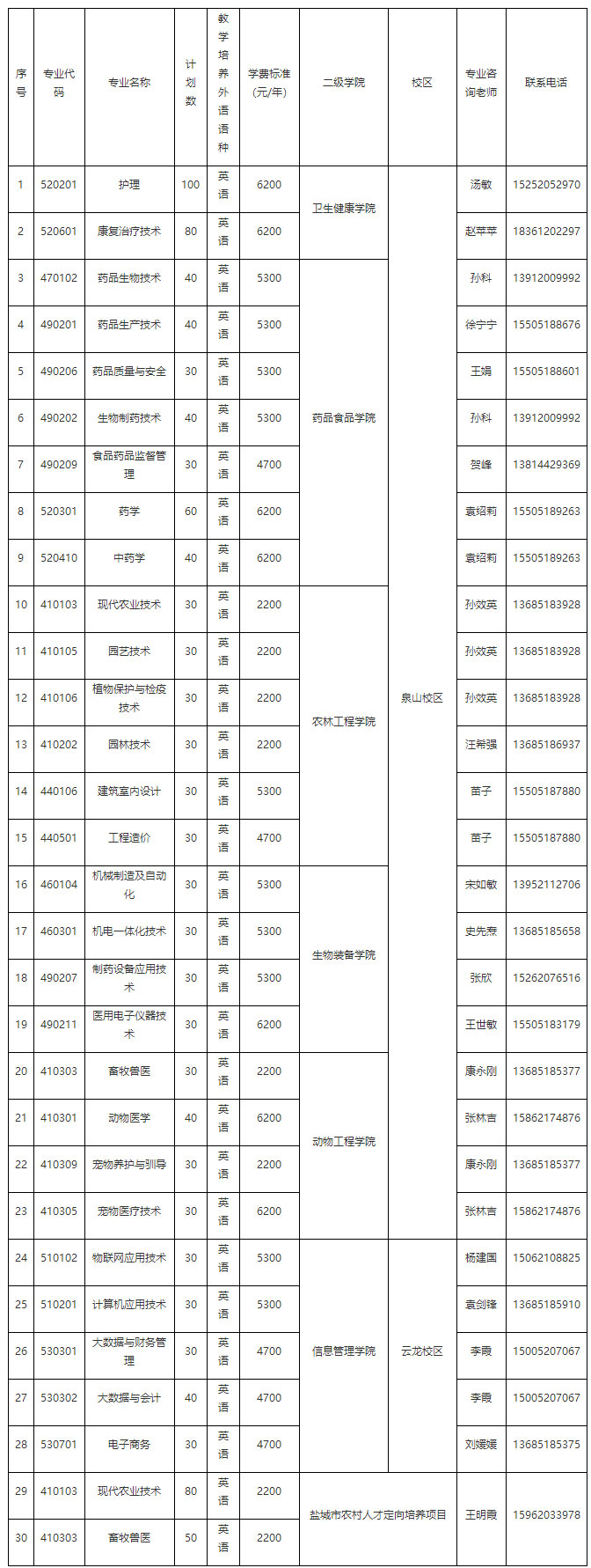 2、盐城市农村人才定向培养项目招生对象须为盐城籍,办学地点在盐城生物工程高等职业学校。
