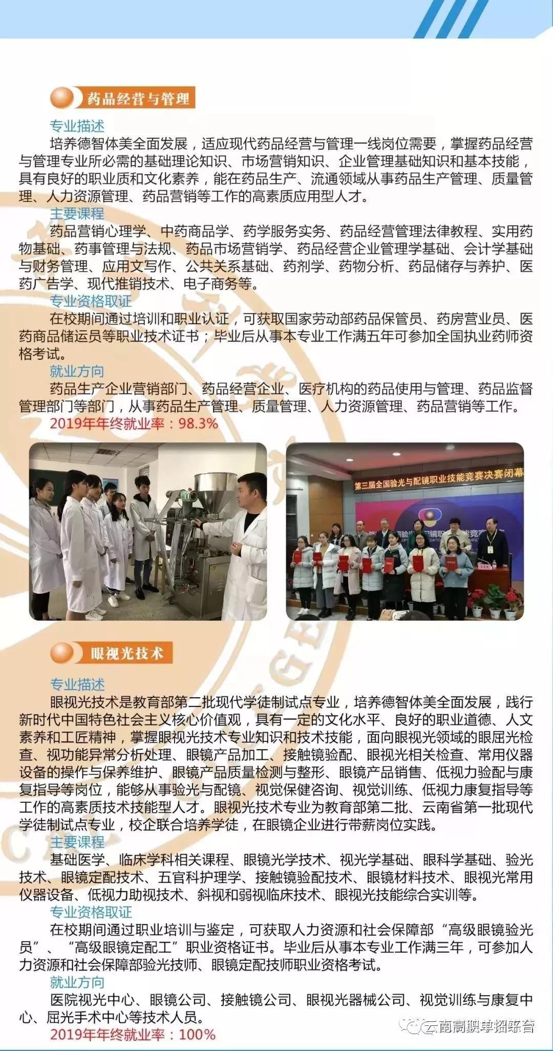 学校面向华南、华中、西南、西北等 15个省、市、自治区招生,现有全日制普通教育在校生9600余人,普通成人学历教育继续教育学生10000余人。历届校友中,涌现出全国最美乡村医生陈金正、全国基层卫生技术标兵饶娅芬、第十一届中国医师奖获得者徐静、两次捐献骨髓干细胞的云南年度新闻人物毛金凤、云南省眼镜验光员技术状元适宏妹、云南省护理技能操作状元侯彩娥、云南省名中医王吉候、云南省医师奖获得者孙婧等大量优秀基层医药卫生工作者。近几年,师生在各类竞赛中获奖 200 余项,代表云南参加国赛获奖项目 11 项(医学影像技术专业连续两年蝉联全国一等奖,护理技能、中药技能大赛选手获奖实现云南省零的突破)、省级奖项 64 项。学生参加国家级、省级、市级各类创新创业创效大赛和大学生课外学术科技创新比赛,获奖110余项,其中全国一等奖2项、二等奖9项、三等奖11项,省级奖项90余项,获奖人数达200余人。近五年学生就业率均在98%以上,毕业生就职岗位与所学专业相关度为 91.04%,学校连续7年荣获云南省高校毕业生就业创业工作目标责任考核一等奖。同时毕业生可通过“专升本”方式升入昆明医科大学、云南中医药大学、大理大学等本科院校就读。