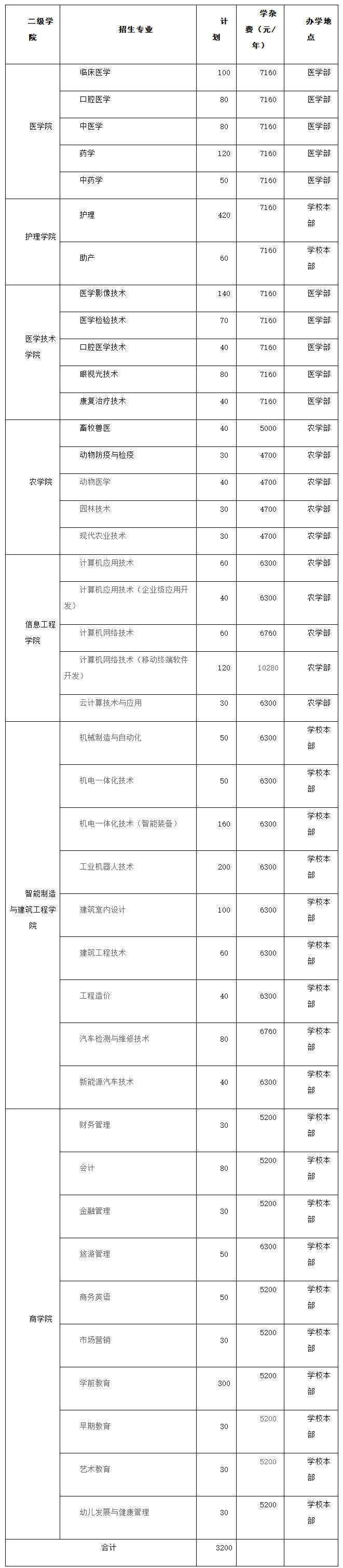 学校现占地面积3362亩,建筑面积47万平方米,固定资产总值11亿多元,其中,仪器设备1.6亿元,馆藏图书90多万册。在在职教职工985人,其中正高职称70人、副高职称264人,专任教师中“双师”素质教师比例82%。设12个二级学院和教学部,开设37个高职专业,面向全国27个省市区招生,全日制在校学生1.9万人。现有国家级教学团队1个,省级教学团队3个;国家级骨干专业3个,省级(示范性)特色专业4个,省级一流特色专业群3个;国家级生产性实训基地1个,国家级协同创新中心1个,省级生产实习实训基地2个,省级教师培训认证基地2个。拥有附属医院、生态养殖场、畅通驾校等三大校内生产性实习实训基地。