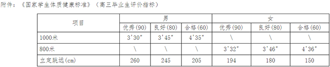 1.体育测试项目为中长跑(男生1000米跑、女生800米跑)和立定跳远两项,执行《国家学生体质健康标准》(高三毕业生评价指标)(详见附件),所有考生均需参加。凡有一项测试不合格者即失去参加综合能力测试资格。因身体原因不能参加体育测试的考生,须出具相关证明;因临时生病不能参加体育测试的考生,凭县级以上医院病历办理缓测手续,录取后在新生报到前先行参加测试并合格后方可办理新生报到手续。
