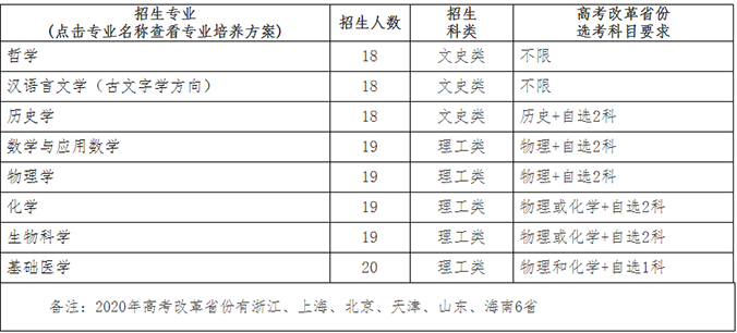 结合学校相关专业优势与办学特色,我校强基计划招生专业为哲学、汉语言文学(古文字学方向)、历史学、数学与应用数学、物理学、化学、生物科学、基础医学8个,招生规模为150人。各专业招生计划及高考改革省份选考科目要求如下: